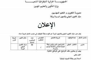 وزارة التكوين و التعليم المهنيين مديرية التكوين و التعليم المهنيين مركز التكوين المهني و التمهين البرمة ورقلة ads الإعلان يعلن مدير مركز التكوين المهني و التمهين البرمة عن فتح مسابقة التوظيف في منصب الشغل المبينة أدناه: منصب الشغلنمط التوظيفشروط الالتحاقالتخصص المطلوبعدد المناصب الماليةمكان التعيينشروط …