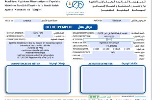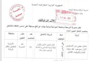 اعلانات توظيف الولايات المعنية: الجزائر العاصمة، بومرداس، جيجل، قسنطينة، ام البواقي، تلمسان، مستغانم، سعيدة، الجلفة، المسيلة، البيض، النعامة، تندوف، ورقلة، تمنراست، توقرت، باتنة، الطارف، قالمة ووهران يرجى من المهتمين التقرب من الادارة المعنية بالعرض او الملحقة المحلية للتشغيل حسب طبيعة الاعلان ads اعلان توظيف …