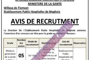 اعلان عن توظيف المؤسسة العمومية الاستشفائية مغنية ads تعلن المؤسسة العمومية الاستشفائية مغنية عن فتح مسابقة توظيف على اساس الشهادة الرتب المبينة ادناه طبيب عام في الصحة العمومية عدد المناصب 05 نمط التوظيف مسابقة على اساس الشهادة ملف المسابقة على أساس الشهادة طلب خطي …