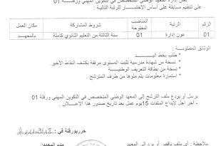 اعلان عن توظيف المعهد الوطني المتخصص في التكوين المهني ورقلة 01 ads تعلن ادارة المعهد الوطني المتخصص في التكوين المهني ورقلة 01 عن فتح مسابقة توظيف على اساس الاختبار في الرتب المبينة ادناه عون ادارة عدد المناصب 01 نمط التوظيف مسابقة على اساس الشهادة …