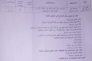 اعلان عن توظيف مديرية الاشغال العمومية لولاية المدية ads تعلن مديرية الاشغال العمومية لولاية المدية عن فتح توظيف على اساس الانتقاء في الرتب المبينة ادناه رئيس فرقة اشغال الري عدد المناصب 02 عامل مهني من المستوى الثاني عدد المناصب 03 حارس عدد المناصب 02 …