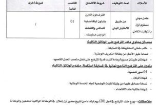 اعلان توظيف المعهد الوطني المتخصص في التكوين المهني المجاهد تريكي خالد بالجلفة ads تعلن ادارة المعهد الوطني المتخصص في التكوين المهني المجاهد تريكي خالد بالجلفة عن فتح مسابقات توظيف على اساس الانتقاء وعلى اساس الاختبار المهني في الرتب المبينة ادناه عامل منهي من المستوى …