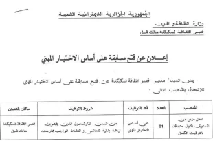 اعلان توظيف قصر الثقافة سكيكدة مالك شبل ads يعلن السيد مدير قصر الثقافة لولاية سكيكدة عن فتح مسابقة توظيف على اساس الاختبار المهني في الرتب المبينة ادناه عامل مهني من المستوى الاول متعاقد بالتوقيت الكامل عدد المناصب 01 نمط التوظيف على اساس الاختبار المهني …