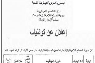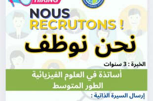 We’re Hiring Nous Recrutons! مدرسة نور العلوم الخاصة ads توظيف اساتذة في العلوم الفيزيائية الخبرة: 3 سنوات الطور المتوسط إرسال السيرة الذاتية: “[email protected]” المقر: بوزريعة مديرية التربية تفتح مسابقة توظيف العمال المهنيين 180 منصب سوناطراك توظف في التخصصات الطبية والادارية وأعوان الأمن مديرية التربية: …
