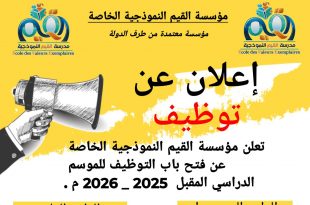إعلان عن توظيف مؤسسة القيم النموذجية الخاصة مؤسسة معتمدة من طرف الدولة ads تعلن مؤسسة القيم النموذجية الخاصة عن فتح باب التوظيف للموسم الدراسي المقبل 2025 – 2026 م. الطور المتوسط أستاذ(ة) الاجتماعيات. أستاذ(ة) الرياضيات. أستاذ(ة) اللغة الإنجليزية. أستاذ(ة) الفيزياء. أستاذ(ة) اللغة الفرنسية. الطور …