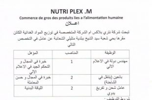 NUTRI PLEX .M Commerce de gros des produits liés à l’alimentation humaine ads إعلان تبحث شركة نتري بلاكس إم الشركة المتخصصة في توزيع المواد الغذائية الكائن مقرها بحي شيخ سعيد الشيح ببلدية متليلي الشعانية عن عامل في التخصص التالي: الوظيفةالمناصبالمؤهلمهندس دولة في الإعلام الآلي1خبرة …