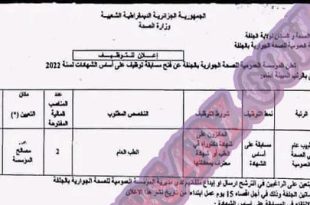 اعلان عن توظيف المؤسسة العمومية للصحة الجوارية بالجلفة ads تعلن المؤسسة العمومية للصحة الجوارية بالجلفة عن فتح مسابقة توظيف على اساس الشهادة بعنوان السنة المالية 2022 في المناصب المبينة ادناه طبيب عام في الصحة العمومية عدد المناصب 02 نمط التوظيف على اساس الشهادة ملف …