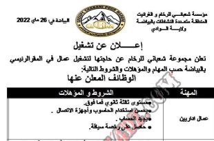 اعلان عن تشغيل ads 26 ماي 2022 تعلن مجموعة شعباني للرخام عن حاجتها لتشغيل عمال في المقر الرئيسي بالبياضة حسب المهام والمؤهلات والشروط التالية الوظائف المعلن عنها عمال اداريين عامل تصفيل للرخام عاملة استقبال عامل الكيتروميكانيك عاملة نظافة يرجى من الراغبين الذين يستوفون الشروط …