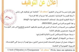 اعلان عن توظيف مدرسة التربية والتعليم الخاصة la plume بوهران ads تعلن ادارة مدرسة التربية والتعليم الخاصة la plume بوهران عن توظيف في رتبتي استاذ المدرسة الابتدائية تخصص لغة عربية ولغة فرنسية استاذ التعليم المتوسط لمختلف التخصصات بما فيها مواد الايقاظ وهذا للموسم الدراسي …