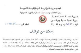 اعلان توظيف بالمديرية الحماية المدنية لولاية المغير ads تنظم مديرية الحماية المدنية لولاية المغير لتوظيف 08 عمال متعاقدين من المستوى الأول صنف 01 الرقم الاستدلالي 200 بعقد محدد المدة بالتوقيت الكلي.08 ساعات.وفقا للمناصب المفتةحة لسنة 2022 ميكانيك السيارات.شاحنات.كهرباء السيارات والشاحنات.بناء.طباخ.عامل نظافة.عامل متعدد الخدمات ملف …