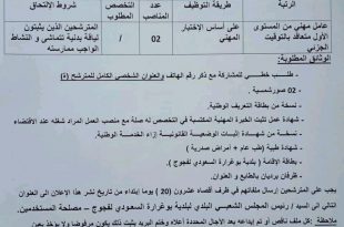 يعلن رئيس المجلس الشعبي البلدي لبلدية بوغرارة السعودي لفجوج عن فتح مسابقة للتوظيف الخارجي على اساس الفحص المهني للالتحاق بالرتبة التالية ads عامل مهني من المستوى الاول متعاقد بالتوقيت الجزئي عدد المناصب 01 نمط التوظيف على اساس الفحص المهني تاريخ نشر الاعلان : 22 …