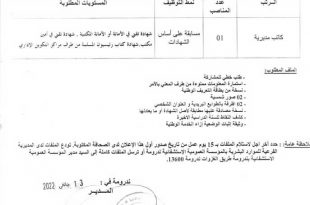 تعلن مديرية المؤسسة العمومية الاستشفائية ندرومة تلمسان عن فتح مسابقة توظيف على اساس الشهادة في المناصب التالية ads كاتب مديرية نمط التوظيف مسابقة على اساس الشهادة عدد المناصب 01 مساعد متصرف نمط التوظيف مسابقة على اساس الشهادة عدد المناصب 01 تاريخ نشر الاعلان : …
