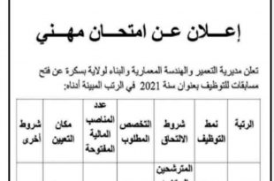 أكمل القراءة »اعلان توظيف بمديرية التعمير والهندسة المعمارية والبناء لولاية بسكرة