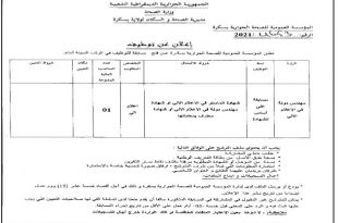 تعلن المؤسسة العمومية للصحة الجوارية بسكرة عن فتح مسابقة توظيف على اساس الشهادات في المناصب التالية ads مهندس دولة في الاعلام الالي عدد المناصب 01 نمط التوظيف مسابقة على اساس الشهادة تاريخ نشر الاعلان : 28 ديسمبر 2021 اخر اجل لايداع الملفات 15 يوم …