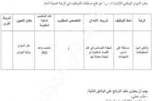 يعلن الديوان الوطني للإشارة البحرية بالجزائر العاصمة عن فتح مسابقة توظيف على أساس الشهادة للالتحاق بالرتب التالية ads وثائقي أمين محفوظات عدد المناصب 01 نمط التوظيف مسابقة على أساس الشهادة تاريخ نشر الاعلان : 21 ديسمبر 2021 اخر اجل لايداع الملفات 15 يوم من …