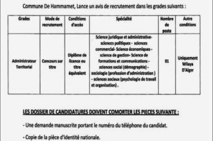 يعلن رئيس بلدية الحمامات بالجزائر العاصمة عن فتح مسابقة توظيف على أساس الشهادة للالتحاق بالرتب التالية ads متصرف اقليمي عدد المناصب 01 نمط التوظيف مسابقة على أساس الشهادة تاريخ نشر الاعلان : 20 ديسمبر 2021 اخر اجل لايداع الملفات 15 يوم من تاريخ الاعلان …