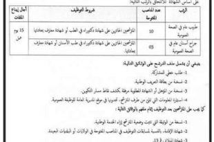 تعلن ادارة المؤسسة العمومية للصحة الجوارية سيدي عقبة بسكرة عن فتح مسابقة توظيف على اساس الشهادات في المناصب التالية ads طبيب عام في الصحة العمومية عدد المناصب 06 نمط التوظيف مسابقة على اساس الشهادة جراح اسنان عام في الصحة العمومية عدد المناصب 01 نمط …