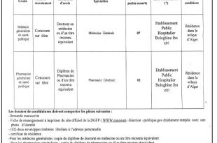 تعلن المؤسسة العمومية الاستشفائية بولوغين ابن زيري بالجزائر العاصمة عن فتح توظيف على اساس الشهادة بعنوان السنة المالية 2021 في المناصب التالية ads طبيب عام في الصحة العمومية عدد المناصب 07 نمط التوظيف مسابقة على اساس الشهادة صيدلي عام في الصحة العمومية عدد المناصب …