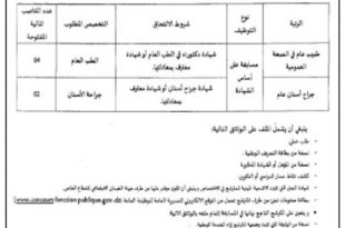 تعلن المؤسسة العمومية للصحة الجوارية بجليدة عين الدفلى عن فتح مسابقة توظيف على اساس الشهادات في المناصب التالية ads طبيب عام في الصحة العمومية عدد المناصب 04 نمط التوظيف مسابقة على اساس الشهادة جراح اسنان عام في الصحة العمومية عدد المناصب 02 نمط التوظيف …