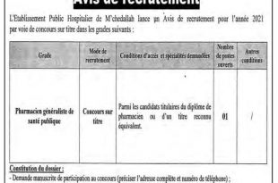 تعلن المؤسسة العمومية الاستشفائية مشدالة البويرة عن فتح مسابقة للتوظيف في الرتب المبينة ادناه لسنة 2021 ads صيدلي عام في الصحة العمومية نمط التوظيف مسابقة على اساس الشهادة عدد المناصب 01 تاريخ نشر الاعلان : 21 نوفمبر 2021 اخر اجل لايداع الملفات 15 يوم …