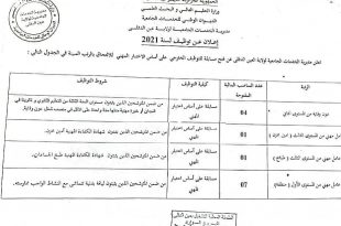 تعلن جامعة فرحات عباس سطيف 1 عن فتح مسابقة للتوظيف بعنوان السنة المالية 2021 في المناصب المبينة ادناه ads مهندس دولة في الاعلام الالي نمط التوظيف على اساس الشهادة عدد المناصب 01 مهندس دولة للمخابر الجامعية نمط التوظيف على اساس الشهادة عدد المناصب 02 …