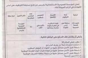 تعلن المؤسسة العمومية الاستشفائية بغريس ولاية معسكر عن فتح مسابقات للتوظيف في الرتب التالية ads طبيب عام في الصحة العمومية عدد المناصب 02 نمط التوظيف مسابقة على اساس الشهادة تاريخ النشر : 12 اكتوبر 2021 آخر أجل لوضع الملفات : بعد 15 يوم من …