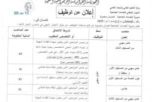 وزارة التعليم العالي والبحث العلمي الديوان الوطني للخدمات الجامعية مديرية الخدمات الجامعية تلمسان منصورة ads إعلان عن توظيف تعلن مديرية الخدمات الجامعية لتلمسان منصورة عن فتح مسابقات للتوظيف على اساس الشهادة وعلى اساس الاختبار المهني في الرتب المبينة أدناه: مديرية التربية تفتح مسابقة توظيف …