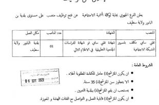 يعلن الفرع الجهوري بجاية لوكالة التنمية الاجتماعية عن فتح توظيف منصب على مستوى بلدية البابور ولاية سطيف ads تقني سامي مكلف بتسيير الشبكة الاجتماعية عدد المناصب 01 تاريخ النشر : 06 سبتمبر 2021 آخر أجل لوضع الملفات : بعد 15 يوم من تاريخ النشر …