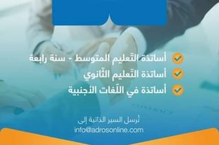تعلن منصّة ” أَدرُس التعليمية ” عن حَاجتِها لـــ: ads • أساتذة التّعليم المتوسط – سنة رابعة (كلّ المواد).• أساتذة التّعليم الثّانوي (كلّ الشّعب والموادّ)• أساتذة ذوي خبرة في اللّغات الأجنبية (فرنسية – إنجليزية – تركية – ألمانية – ….)يشترط في المتقدّمين• الخبرة والكفاءة …