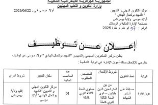 وزارة التكوين و التعليم المهنيين مصلحة الإدارة المالية و الوسائل مركز التكوين المهني والتمهين الشهيد بوكحال الهادي أولاد موسى ولاية بومرداس في: 2025/06/22 ads إعلان عن توظيف يعلن مركز التكوين المهني و التمهين “الشهيد بوكحالي الهادي” أولاد موسى عن توظيف خارجي للإلتحاق بسلك أعوان …