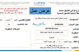 وزارة العمل والتشغيل والضمان الاجتماعي الوكالة الوطنية للتشغيل الفرع الولائي للتشغيل معسكر الملحقة المحلية للتشغيل المحمدية ads عرض عمل الهيئة المستخدمة: الديوان الوطني للسقي وصرف المياه وحدة الاستغلال هبرة القطاع القانوني: العام تاريخ تسجيل العرض: 22/06/2025 المهنة المطلوبة: عامل متخصص في الشبكات الهيدروليكية مكان …