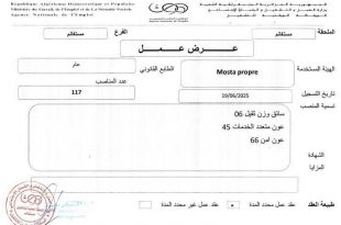 وزارة العمل و التشغيل و الضمان الاجتماعي الوكالة الوطنية للتشغيل الفرع مستقاتم الملحقة مستقاتم ads عرض عمل الهيئة المستخدمة: Mosta propre تاريخ التسجيل: 19/06/2025 عدد المناصب: 117 المنصب سائق وزن ثقيل 06 عون متعدد الخدمات 45 عون امن 66 الطابع القانوني: عام طبيعة العقد: …