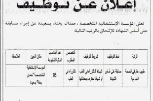 تعلن المؤسسة الاستشفائية المتحصصة حمدان بختة عن اجراء مسابقة توظيف على اساس الشهادة للالتحاق بالرتب التالية ads طبيب عام ف الصحة العمومية عدد المناصب 05 نمط التوظيف مسابقة على اساس الشهادة تاريخ النشر : 25 جويلية 2021 آخر أجل لوضع الملفات : بعد 15 …