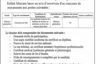 تعلن المؤسسة الإستشفائية المتخصصة الأم والطفل بمعسكر Ehs Mascara عن فتح مسابقة توظيف على اساس الشهادة في المناصب التالية ads طبيب عام في الصحة العمومية نمط التوظيف مسابقة على اساس الشهادة عدد المناصب 04 تاريخ نشر الاعلان في الجرائد 12 جويلية 2021 اخر اجل …