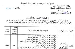 باتنة في 12 جوان 2025 وزارة الثقافة والفنون المدرسة الجهوية للفنون الجميلة باتنة ads إعلان عن توظيف تعلن إدارة المدرسة الجهوية للفنون الجميلة باتنة عن تنظيم مسابقة على أساس الإختبار المهني للتوظيف بعنوان سنة 2025 للالتحاق بالرتبة المبينة أدناه للمترشحين القاطنين بالولاية محل المنصب: …