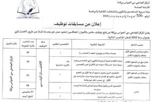 المركز الجامعي مي الجواس بريكة نيابة مديرية المستخدمين والتكوين والنشاطات الثقافية والرياضية الامانة العامة ads إعلان عن مسابقات توظيف يعلن المركز الجامعي سي الجواس ببريكة عن فتح توظيف خاص بالأعوان المتعاقدين (عقود عمل غير محددة المدة) عن طريق الاختبار المهني بعنوان سنة 2025 لشغل …
