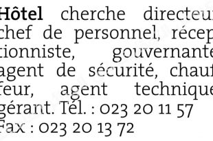 فندق بالجزائر العاصمة يوظف : ads ✓ مدير✓ رئيس شؤون الموظفين✓ مضيف(ة) إستقبال✓ حاكمة✓ عون أمن✓ سائق✓ عون تقني✓ مسيريرجى التواصل عن طريق رقمي الهاتف التالية 023201157 او الفاكس 023201372