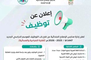 إعلان عن توظيف ads تعلن إدارة مدارس الإصلاح الابتدائية عن فتح باب التوظيف للموسم الدراسي الجديد 1447هـ / 2025 – 2026 م. (للفترة الصباحية والمسائية). المناصب الشاغرة: أساتذة اللغة العربية (جميع المواد): صباحاً – مساءً 01 مشرف تربوي في اللغة العربية 01 مشرف تربوي …