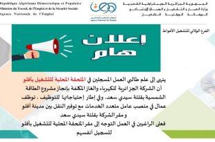 وزارة العمل والتشغيل والضمان الاجتماعي الوكالة الوطنية للتشغيل الفرع الولائي للتشغيل الأغواط ads إعلان هام يُنهى إلى علم طالبي العمل المسجلين في الملحقة المحلية للتشغيل بأفلو أن الشركة الجزائرية للكهرباء والغاز المكلفة بإنجاز مشروع الطاقة الشمسية بقلتة سيدي سعد، وفي إطار إحتياجاتها للتوظيف، توظف …