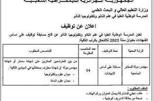 وزارة التعليم العالي و البحث العلمي المدرسة الوطنية العليا في علم النانو و تكنولوجيا النانو ads إعلان توظيف تعلن المدرسة الوطنية العليا في علم النانو وتكنولوجيا النانو عن فتح مسابقة توظيف على أساس الشهادات بعنوان سنة 2025 للالتحاق بالرتب التالية: الرتبة المعنيةنمط التوظيفعدد المناصب …