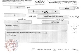 وزارة العمل و التشغيل و الضمان الاجتماعي الوكالة الوطنية للتشغيل الملحقة مستغانم الفرع مستغانم ads عرض عمل الهيئة المستخدمة: المرصد الوطني للبيئة و التنمية المستدامة الطابع القانوني: عام تاريخ التسجيل: 21/05/2025 تسمية المنصب: Ingénieur chimiste عدد المناصب: 01 الشهادة: Expérience aux analyse physico-chimiques des …
