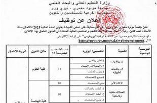 وزارة التعليم العالي والبحث العلمي جامعة مولود معمري – تيزي وزو ads المديرية الفرعية للمستخدمين والتكوين اعلان عن توظيف تعلن جامعة مولود معمري بتيزي وزو عن فتح مسابقة على أساس الشهادة بعنوان السنة المالية 2025 للالتحاق بسلك الأساتذة المساعدين، رتبة “أستاذ مساعد” في التخصصات …