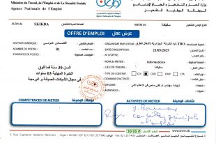 وزارة العمل والتشغيل والضمان الاجتماعي الوكالة الوطنية للتشغيل الفرع الولائي للتشغيل سكيكدة ads عرض عمل الجهة المستخدمة: الشركة الجزائرية لأشغال الطرق ALTRO التاريخ التسجيل: 21/05/2025 المنصب المطلوب: informaticien مكان العمل: سكيكدة نوع العقد: CDD شهادة: مهندس أو تقني سامي في الإعلام الآلي القطاع القانوني: …