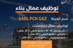 توظيف عمّال بناء ads اسم الشركة SARL PCH GAZفتح باب التوظيف في التخصصات التالية دال دوصول 45 * 45 (ماصو كاليفي) (20 عامل) فايونس (ماصو كاليفي) (20 عامل) بلاد مونوكوش (ماصو كاليفي) (20 عامل) المهتم يتصل بالأرقام التالية: 06.60.48.55.56 06.68.84.77.77 مكان العمل سكيكدة بلدية …