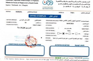 وزارة العمل والتشغيل والضمان الاجتماعي الوكالة الوطنية للتشغيل الفرع الولائي للتشغيل تندوف الملحقة المحلية للتشغيل تندوف ads عرض عمل الهيئة المستخدمة: SNTP تاريخ التسجيل: 11/05/2025 المناصب المطلوبة: 11/05/2025 العدد: 10 الشهادات أو الشروط المطلوبة: Permis de conduire lourd ملاحظة: يتم معالجة عرض العمل آنيا …