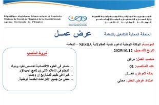 وزارة العمل والتشغيل والضمان الاجتماعي الوكالة الوطنية للتشغيل الملحقة المحلية للتشغيل بالنعامة ads عرض عمل المؤسسة: الوكالة الوطنية لدعم وتنمية المقاولاتية NESDA – النعامة تاريخ التسجيل: 2025/10/12 منصب العمل: مرافق عدد المناصب: 01 حالة العرض: فعال امتداد عرض العمل: محلي شروط المنصب ماستر في …