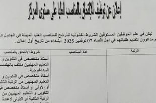 وزارة التكوين و التعليم المهنيين مديرية التكوين و التعليم المهنيين لولاية قسنطينة معهد عبد الحميد بن باديس قسنطينة ads 13 أكتوبر 2025 إعلان عن توظيف للالتحاق بالمناصب العليا على مستوى المركز ليكن في علم الموظفين المستوفين الشروط القانونية للترشح للمناصب العليا المبينة في الجدول …