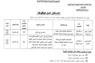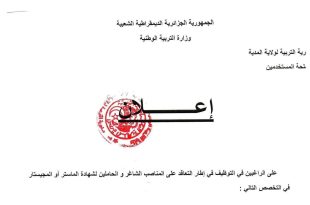وزارة التربية الوطنية مديرية التربية لولاية المدية ads إعـــــــلان على الراغبين في التوظيف في إطار التعاقد على المناصب الشاغرة و الحاملين لشهادة الماستر أو الماجيستار في التخصص التالي : – الفلسفة التقدم إلى مديرية التربية لولاية المدية مصلحة المستخدمين لإيداع طلباتهم مرفوقين بالوثائق التالية …