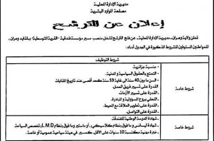 وزارة الصحة مديرية الصحة والسكان لولاية غليزان المؤسسة العمومية الاستشفائية بغليزان ads إعلان توظيف عن طريق المسابقة على أساس الانتقاء تعلن المؤسسة العمومية الاستشفائية بغليزان عن فتح مسابقة على أساس الانتقاء للرتبة المبينة أدناه: الرتبةنمط التوظيفمسابقة على أساس الانتقاءشروط التوظيفعدد المناصبمكان التعيينشروط أخرىمساعد تمريض …