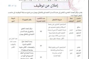 وزارة التعليم العالي والبحث العلمي مركز البحث العلمي والتقني في علم الإنسان الاجتماعي والثقافي بوهران ads إعلان عن توظيف يعلن مركز البحث العلمي والتقني في علم الإنسان الاجتماعي والثقافي بوهران عن فتح مسابقة التوظيف في المناصب الشاغرة المبينة أدناه: المنصب المطلوبنمط التوظيفشروط الالتحاقعدد المناصب …